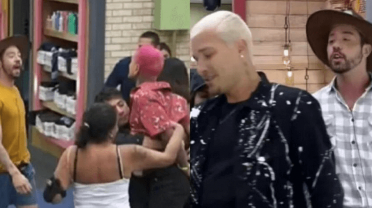 Revoltado com a atitude, o humorista pegou a primeira garrafa que estava na mesa e jogou o líquido na direção de Victor para revidar, mas viu o ator usar o seu chapéu de fazendeiro para se proteger.